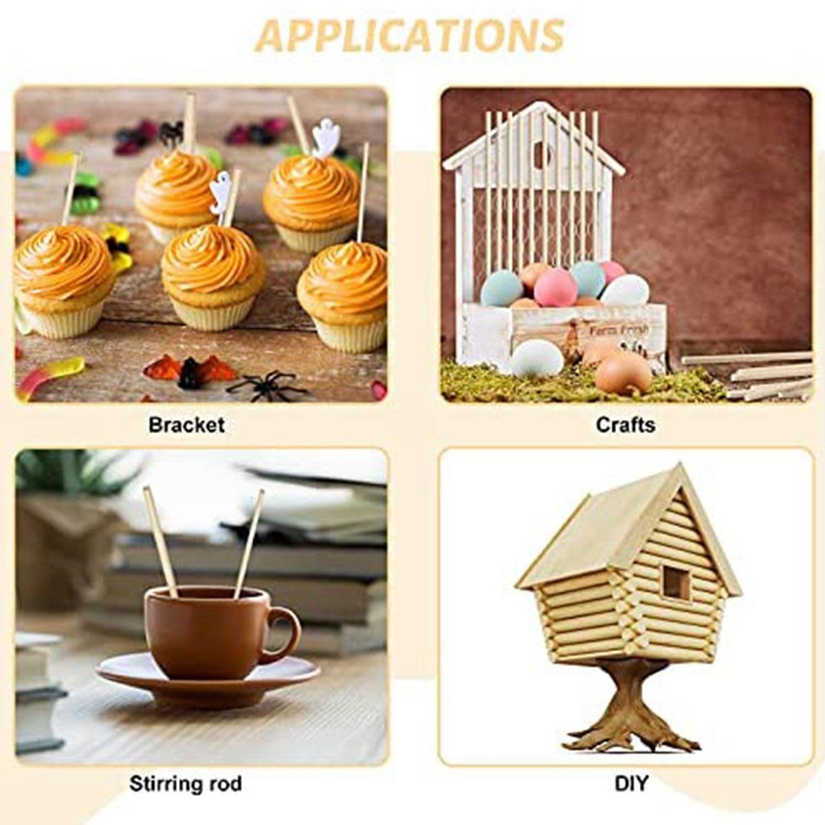 Creative Uses: Our dowel sticks are widely used as DIY materials to make architectural models, handmade roses, wedding props, ribbon sticks, photo props and more, and they can also be used as materials in the kitchen, such as lollipops and ice cream a part of.