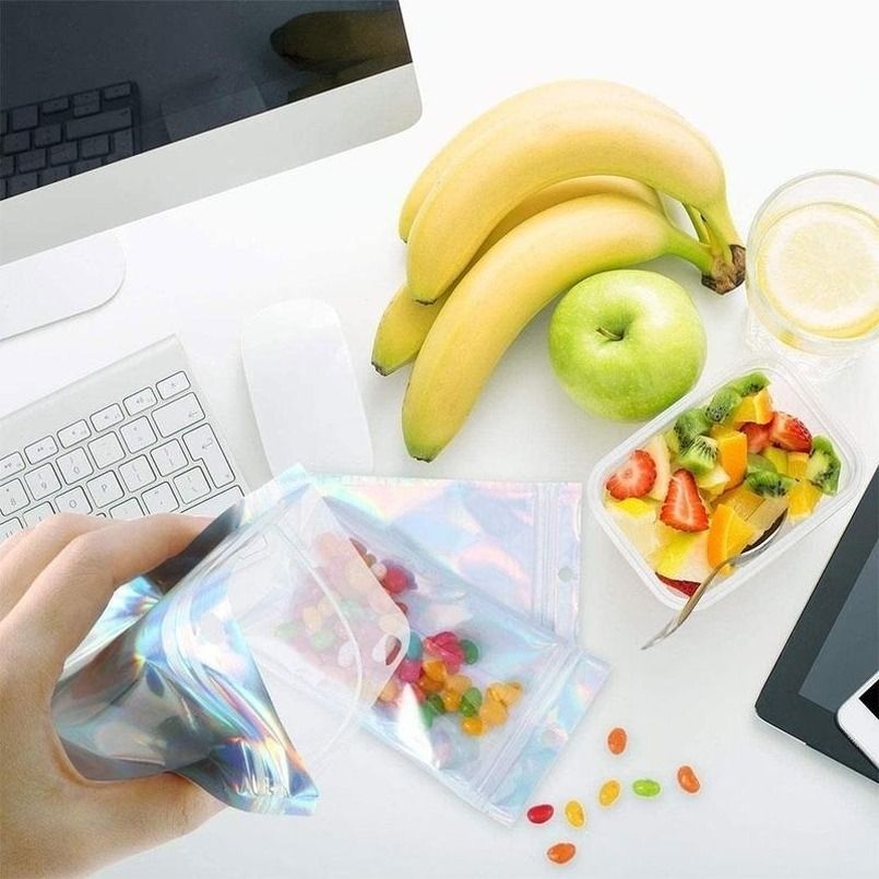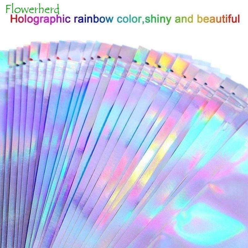 Material:Aluminum foil bag Size:7x10cm(2.75*3.93in), 8x13cm(3.14*5.11in), 10x15cm(3.93*5.9in), 14x20cm(5.51*7.87in), 6x10cm(2.36*3.93in), 7.5x12cm(2.95*4.72in), 9x12cm(3.54*4.72in), 9x16cm(3.54*6.29in), 10x18cm(3.93*7.08in), 12x20cm(4.72*7.87in), 16x24cm(6.3x9.45in), 18x26cm(7.09x10.23in), 20x30cm(7.87x11.8in), : 1 inch = 2.54cm or 1cm = 0.393 inch Easy to use with sealing strip, help to keep moisture, dust and odor, save your effort, keep things clean Holographic rainbow color: Made of high-quality metal film, durable and shiny, silver front hologram, transparent, reusable and safe to use Versatile use: Ideal for home, school and office use. It can be used for candles, coffee beans, dried flowers, baking, dried fruits, biscuits, tea, nuts, cosmetics, soap and notebooks. Package quantity:100 pcs bags, enough for your use and replacement