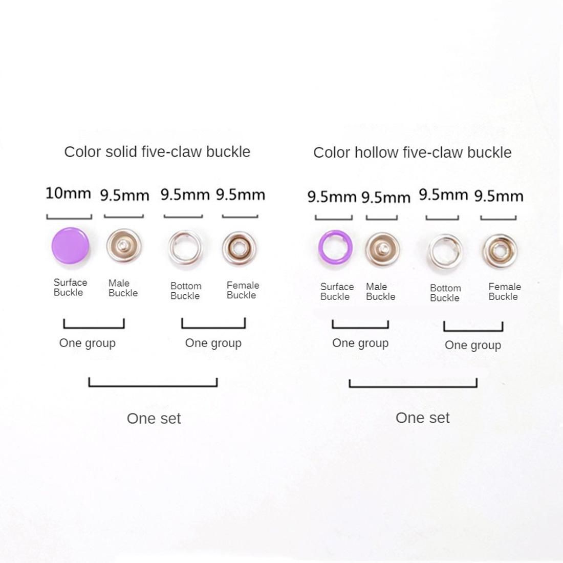 Wide Range of Uses: With 10 vibrant colors, hollow snap buttons(9.5mm) 50sets, solid snap buttons(10mm) 50sets, our snap buttons are perfect for DIY crafts, making clothes, backpacks, hats, baby jumpsuits, quilt covers, curtains, raincoats, pet clothes, and more.