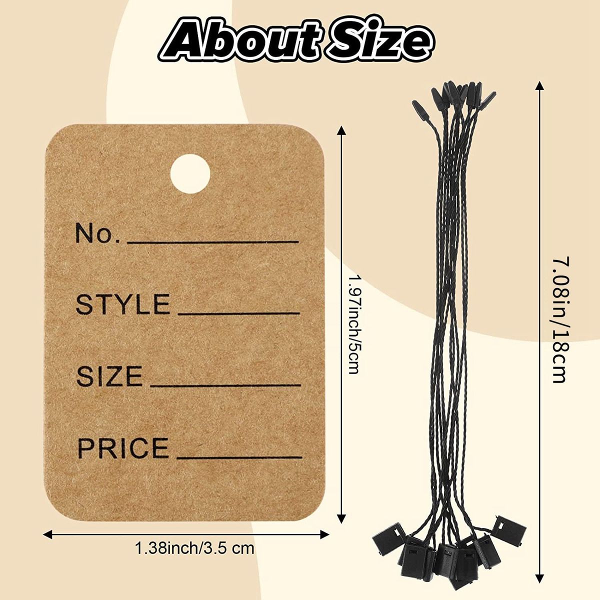 Size details: price marking tag is 1.38 x 1.97 inch/ 3.5 x 5 cm, tag hole is 4 mm, and 7 inch/ 18 cm string is suitable for tag holes with a diameter of 1/8th inch and larger.