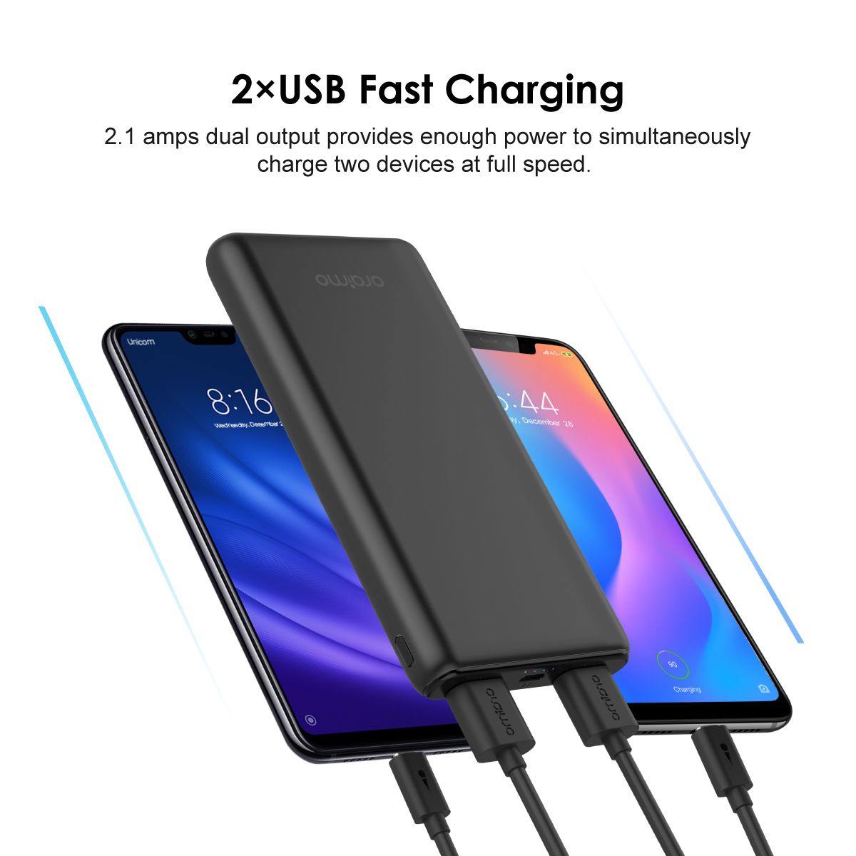 Dual Charging ports with Oraimofast charging technology. Charge two devices at the same time without sacrificing the speed.