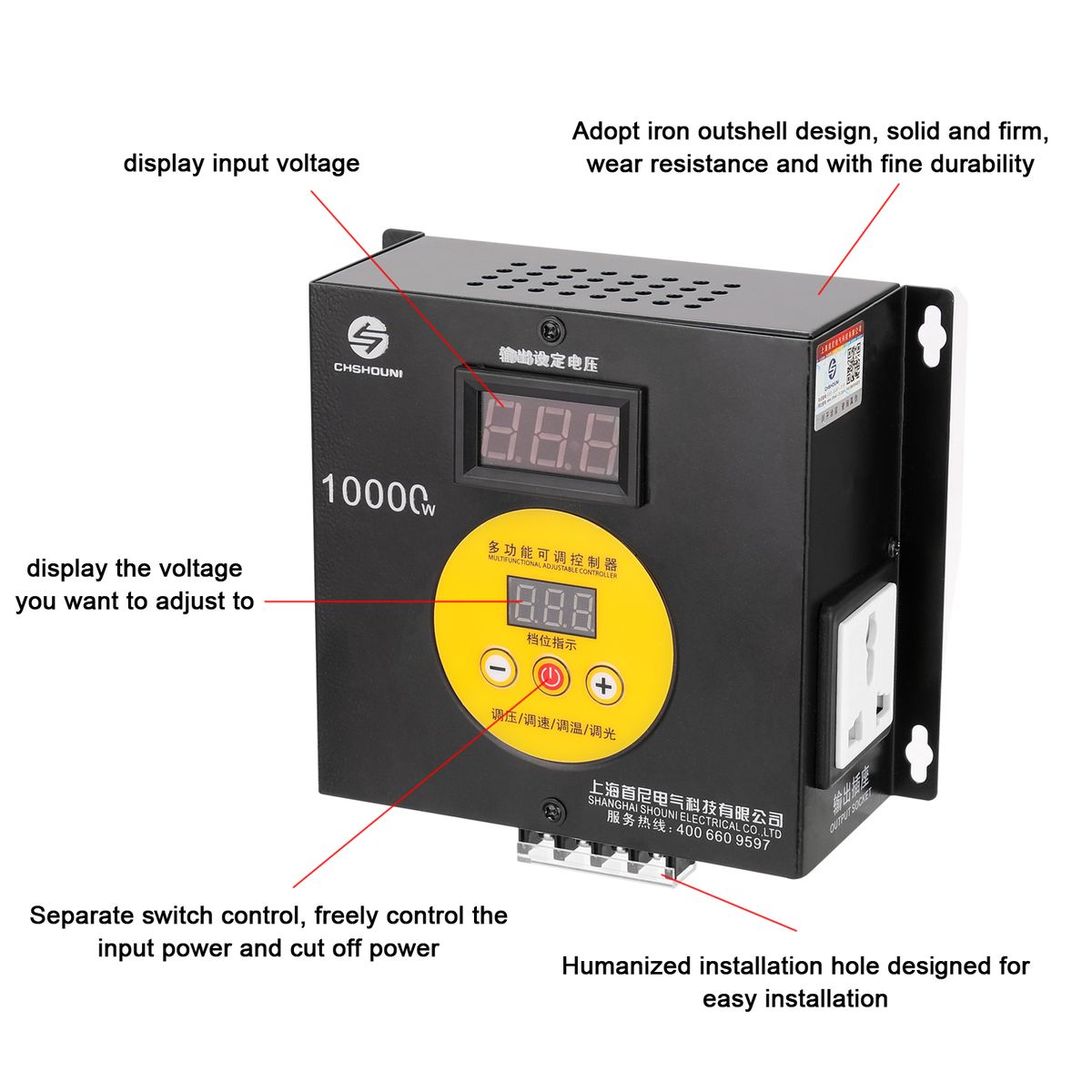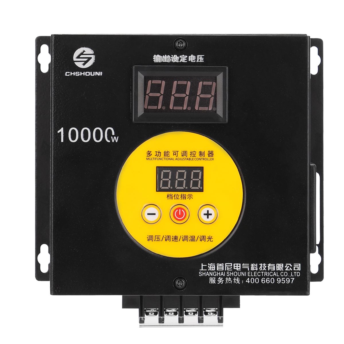 This is a kind of 10000W high power multifunction voltage regulator, stepless regulation, easy to adjust the speed, temperature, voltage and light. Equipped with two digital display, one for display input voltage, another for display the voltage you want to adjust to, and the adjustable voltage is range-from 0-220V. You can have a try.