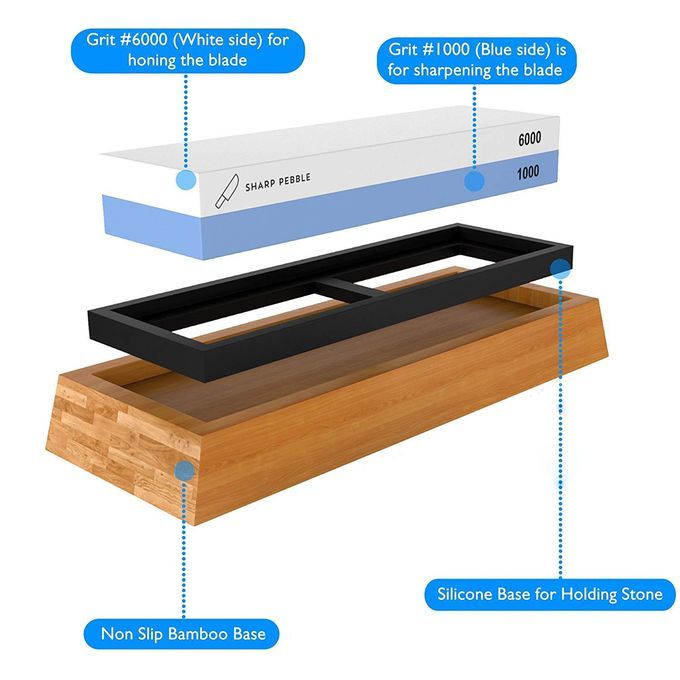 This complete cutter sharpening kit comes with double sided (#1000/ #6000) premium quality whetstone, bamboo base for holding the stone, and cutter sharpening angle guide.