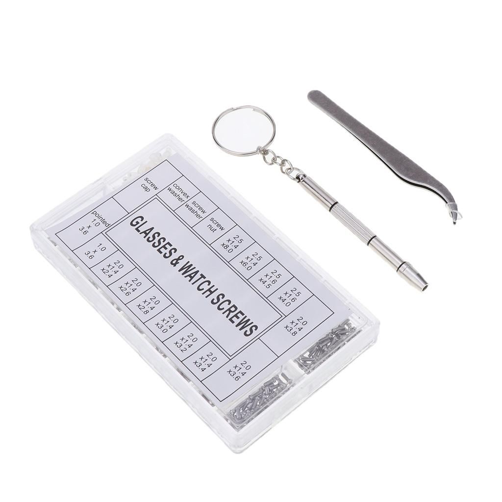 The glasses repair tool kit includes: Screws nut, screw caps, screw washer, screw tips, screwdriver and tweezers.