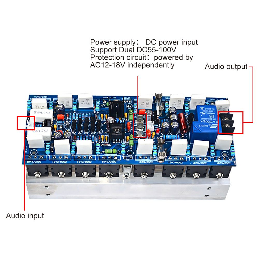 The newly designed V16 high-power mono power amplifier board is suitable for high-fidelity home, stage performance, profeional power amplifier machine, full of power, clear and powerful sound quality, pure, input first adopts op amp amplification proceing, and then double differential circuit for preamp Zoom in, the tone is clear and delicate! Push the level with two-stage push, first use the medium power T-oshiba to 2CA1930/2SC5171 to push a pair of TTC5200/TTA1943 and then use this pair of high-powered to push 7 pairs of new TTC5200/TTA1943 parallel output, this design can Let the effect increase, the thrust is full, enough The is made of , ensuring enough preure resistance, the effect is shocking, and the strength is extraordinary. Optimized circuit design, integrated switch mute, over temperature protection, overload protection, high overall noise ratio, almost always heard noise Supply voltage range: reliable operation between Dual DC55V-100V (Recommended working voltage DC double 60 volts, the transformer's foot power is more than 500W, of course, to fully play the power of the power amplifier board, to use more than 1000W), transformer power is very ant when enjoying large dynamic music. It allows you to truly understand what is shocking and what is the sense of the scene. It is recommended to use the AC dual 50-70V ring cow transformer (1000W or more) and then use the rectified power board. The protection circuit requires a separate power supply (AC 12-18V must use separate windings, and cannot be shared with others).