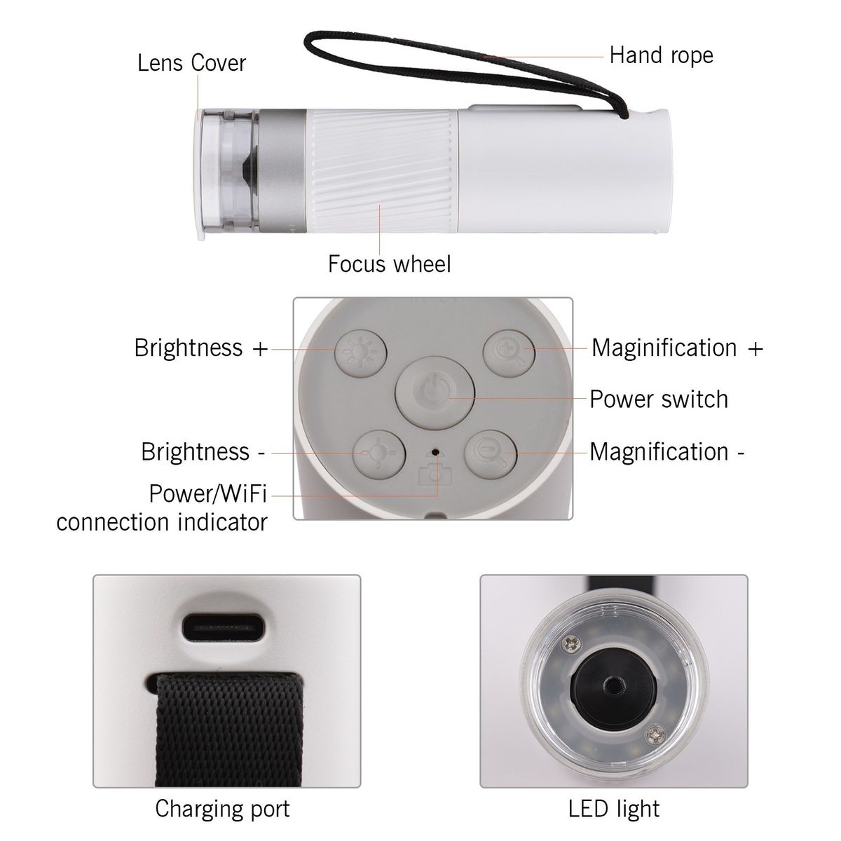 [APP Function amp; Built-in Battery] You can save what you see through the digital microscope by picture or video, so that you can share it with your families and friends; built-in 700mAh large capacity battery, no need of frequent charging.