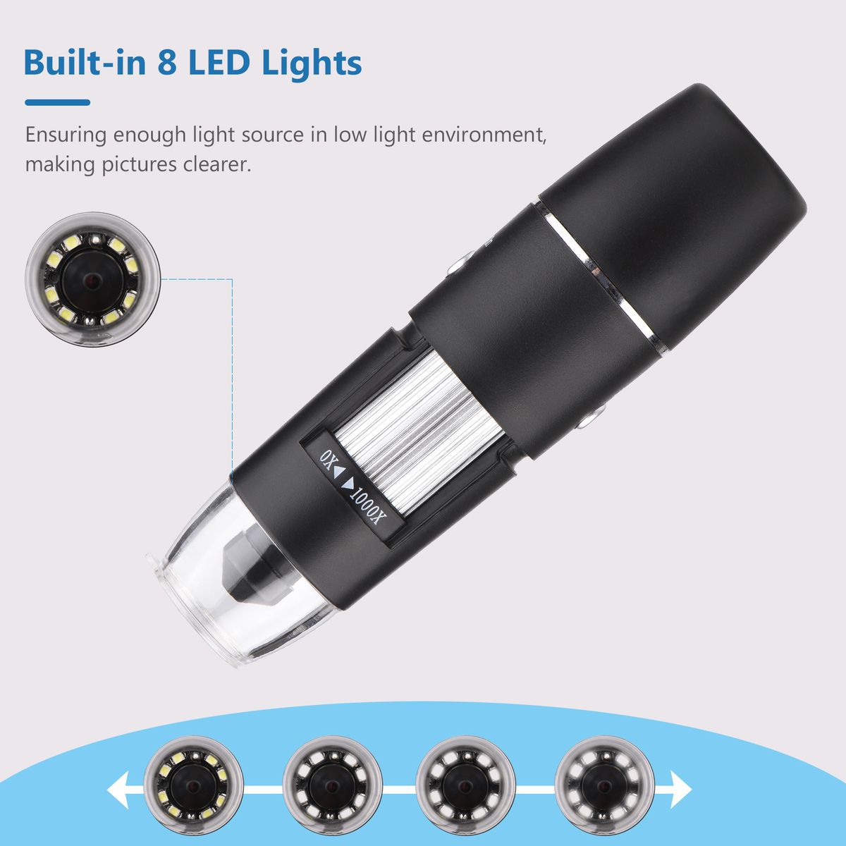 [1000X Magnification] 640 * 480 resolution, built-in 8pcs high-quality LED lamp beads, adjustable brightness, the imaging you observe is of high clarity and brightness.