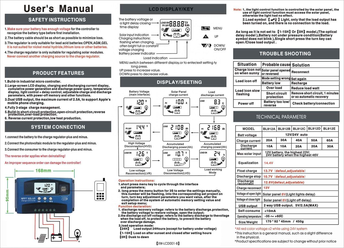 Specifications:Battery voltage: 12V/24V Auto Adapt