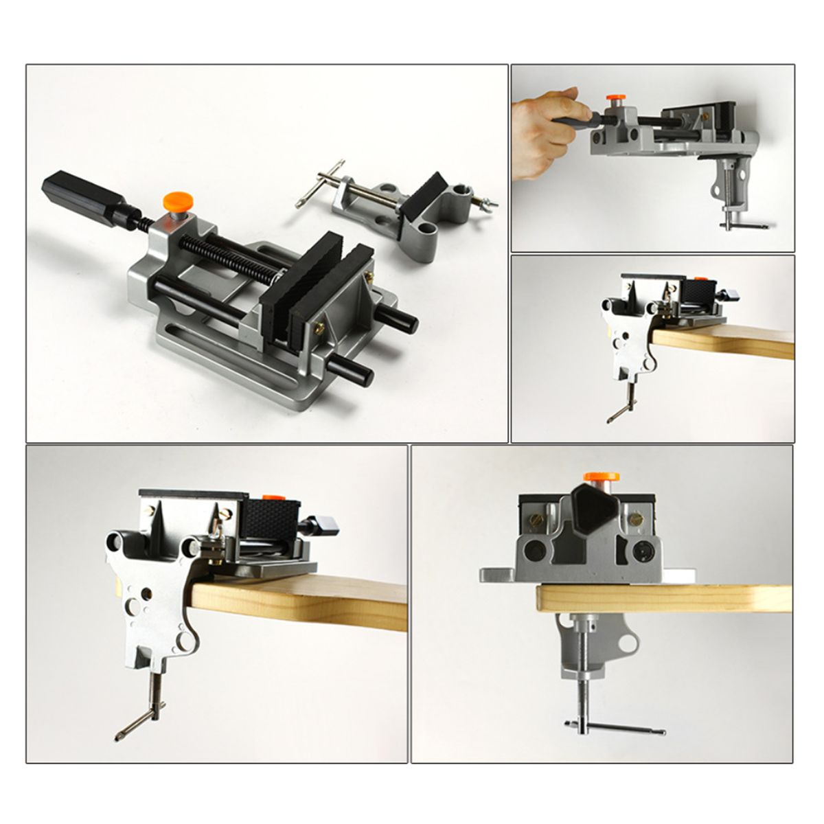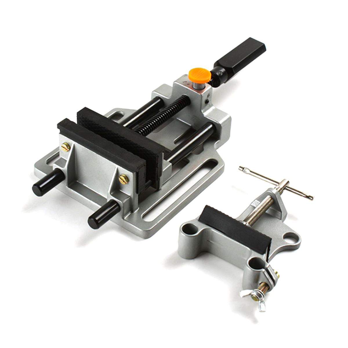 Vise in sturdy cast aluminum alloy, jaw capacity 100mm. Hardened steel jaw quick release mechanism for drill presses or work benches. Release button for quick clamping action.
