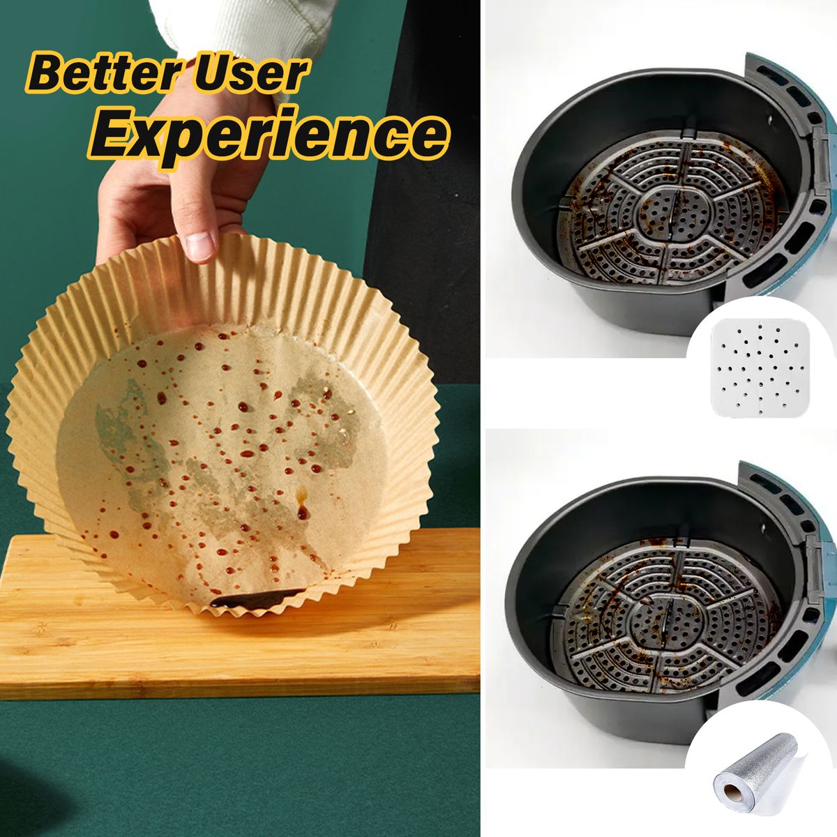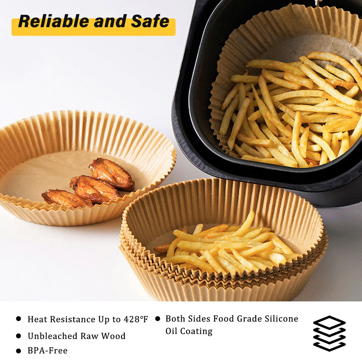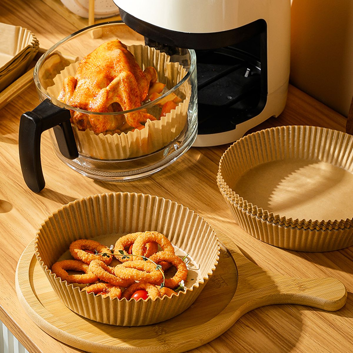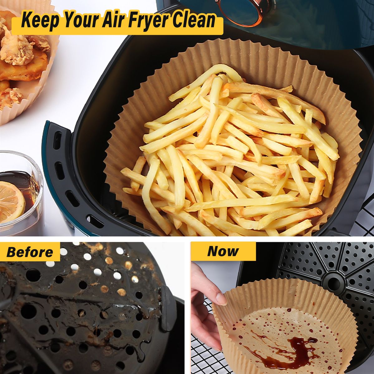 KEEP THE FRYER CLEAN: When the food is directly put into the fryer, the oil and food residue can make the fryer so sticky and dirty. So the liner paper can perfectly solve such problem. Put the paper into the fryer, oil and residue stays in the paper. And the raised edge of the paper can prevent oil from splashing on the inner wall of the fryer. Then it is easy to clean the fryer after using.