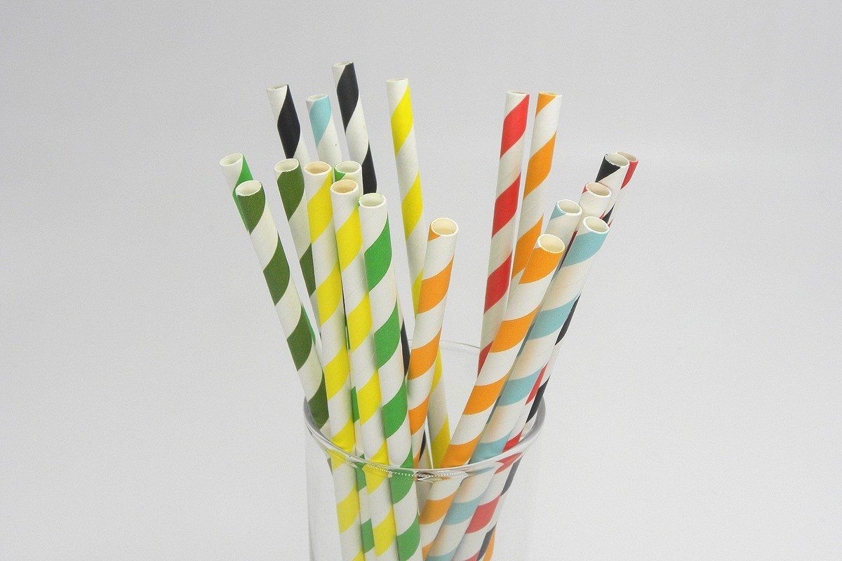 These popular multi color striped paper straws are made from premium FSC certified food grade paper, and printed with water-based food safe inks.