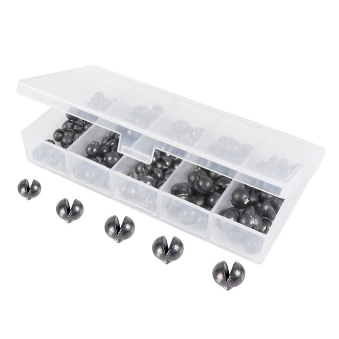 100/120 pieces Split-Shot Sinker with 5 different sizes stored in box with 5 compartments for easy recognition and placing in order
