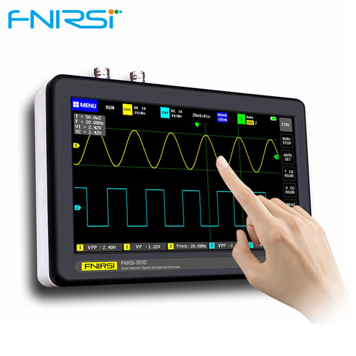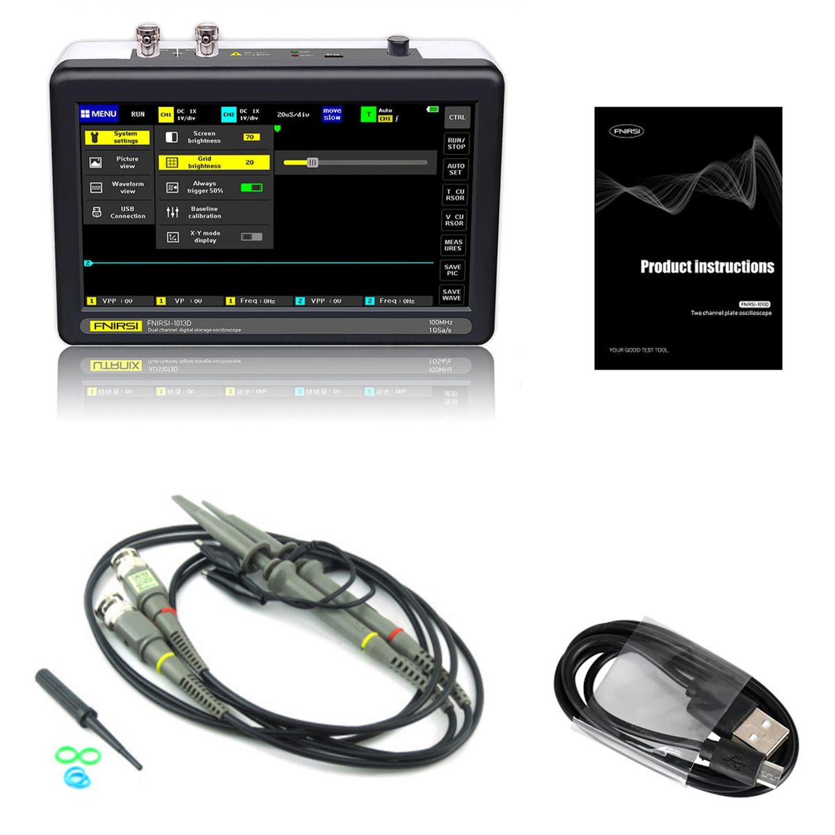 Complete function, with three modes: automatic, single, and normal. The single mode tests sudden non-periodic burst signals, such as car ignition signals; the normal mode tests non-periodic digital signals, such as infrared remote control signals; The automatic mode tests periodic analog signals, such as sinusoidal signals; it has a wide range of uses. 1 key automatic adjustment, no need for tedious manual adjustment, built-in efficient algorithm, high adjustment accuracy, manual cursor measurement. 1 1 waveform built-in 1GB storage space, can store up to 1000 screenshots and 1000 sets of waveform data, the storage process is simple and fast, it is very convenient to take screenshots and save current waveforms .