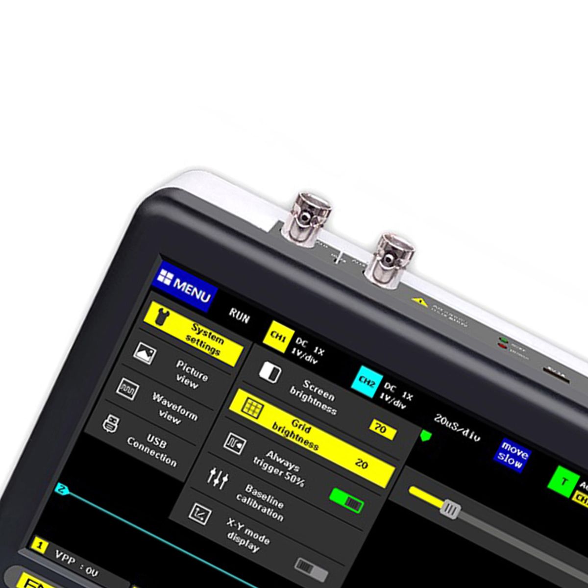 Complete function, with three s: automatic, single, and normal. The single tests sudden non-periodic burst signals, such ignition signals; the normal tests non-periodic signals, such as remote control signals; The automatic tests periodic analog signals, such as sinusoidal signals; it has a of uses. automatic adjustment, for tedious manual adjustment, built-in efficient algorithm, high adjustment accuracy, manual cursor measurement. 1 save waveform built-in 1GB storage space, up to 1000 screenshots and 1000 sets of waveform data, the storage process is simple , it is very convenient to take screenshots and save current waveforms .