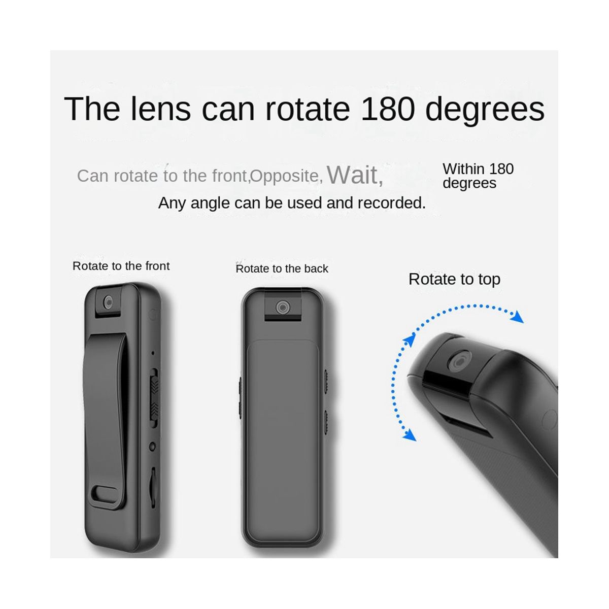 The lens can be rotated 180 degrees and can be rotated to the front,back,top,etc.and can be used and recorded at any angle within 180 degrees