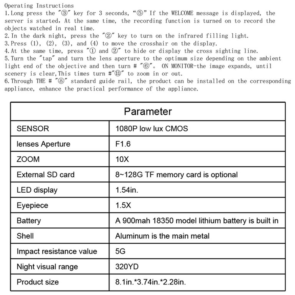 【Professional Night-Visions】: This night-visions device has 30mm diameter object lens, F1.6mm lens diaphragm can provide a wider field of view, 1080P clear definition, with 10X optical magnification. These professional designs make this night-visions device suitable for your daily use.