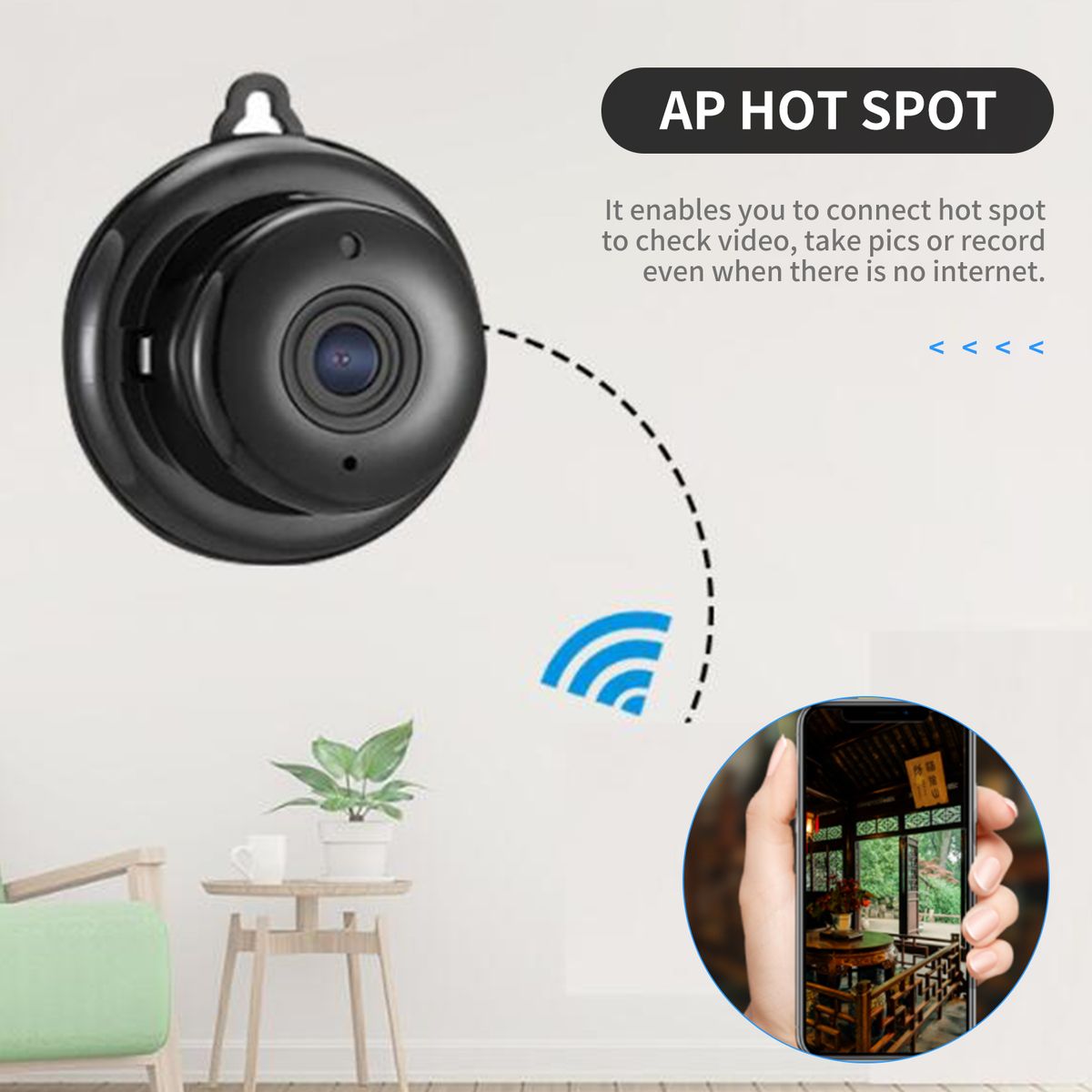 Inserting a micro SD card, it supports 24/7 auto continuously recording and can easily playback on phone app (Support 8~64GB micro SD card and card is not included.)