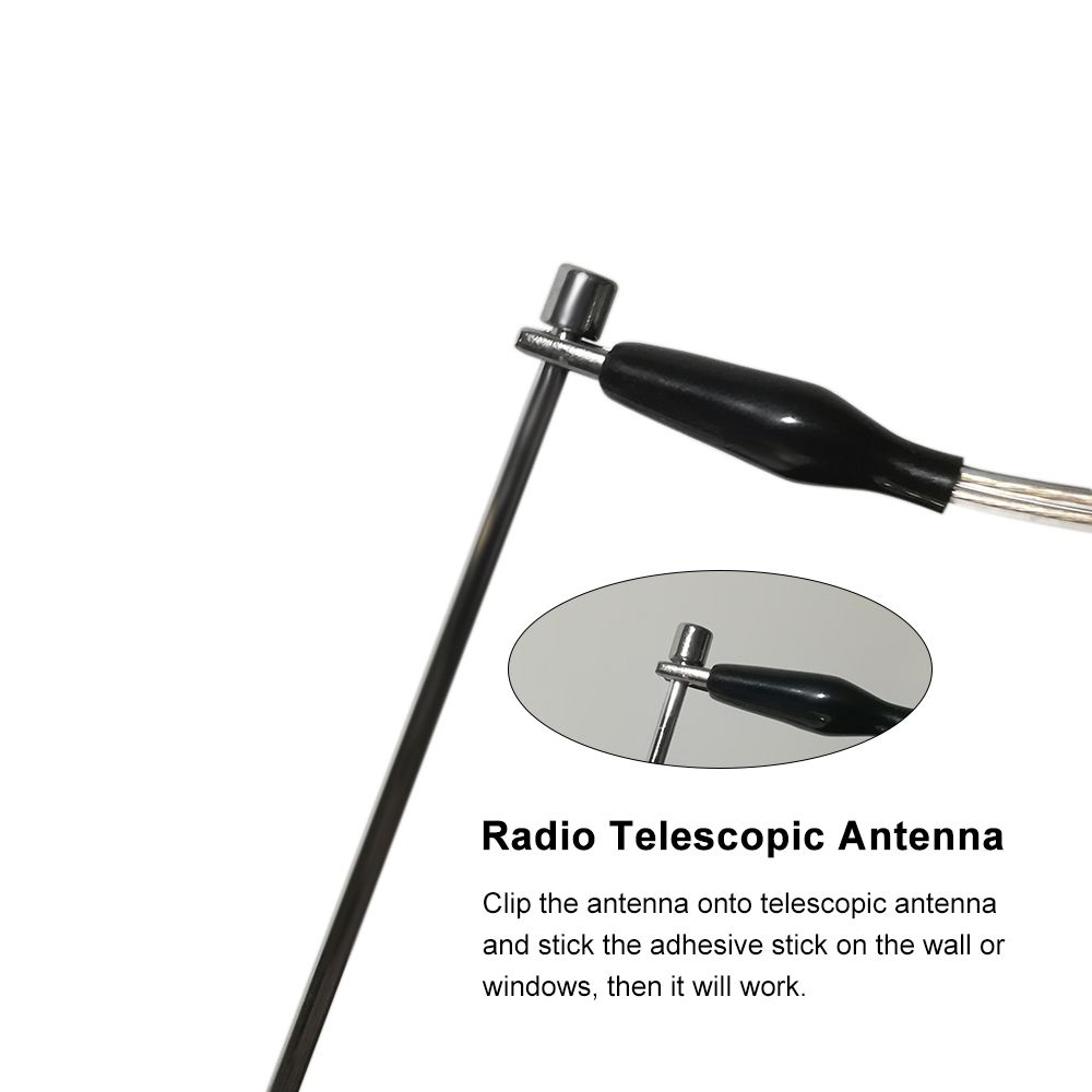 This antenna is compatible with all radios with telescopic antenna, it can help enhance the signal. The pure-copper double cables bring stable signal transferring and 3.2-meter length is enough for your daily use. The installation is pretty simple, clip the antenna onto telescopic antenna and stick the adhesive stick on the wall or windows, then it will work. It will bring much convenience for your daily life.