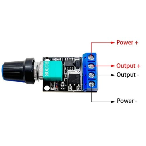 - Duty cycle: 0%-99% (0% position is the state of the switch off when the potentiometer is most on the left).