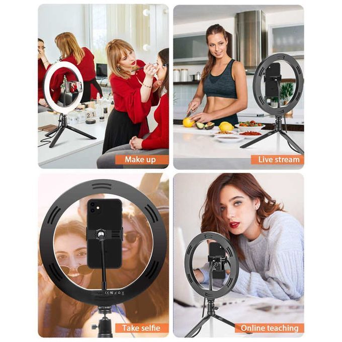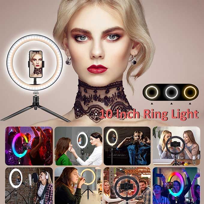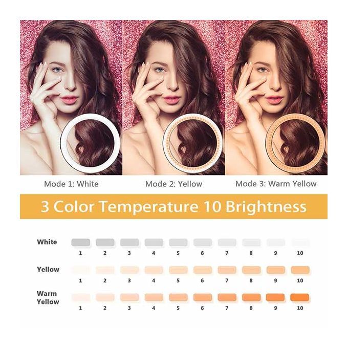 Ring light:The brightness is adjustable. The LED ring light provides 3 color lighting modes and 10 brightness levels, including warm light, natural light and white light, with uniform light. You can literally find the modes and brightness that create a unique atmosphere to meet your various needs.For example, selfies, tiktok videos, makeup, live broadcasts, Instagram photos, YouTube videos, etc.