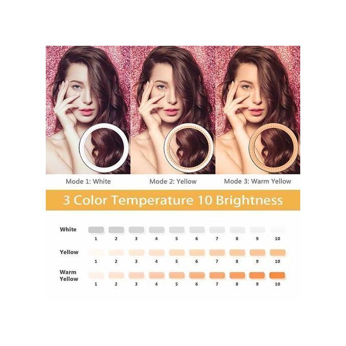 Ring light:The brightness is adjustable. The LED ring light provides 3 color lighting modes and 10 brightness levels, including warm light, natural light and white light, with uniform light. You can literally find the modes and brightness that create a unique atmosphere to meet your various needs.For example, selfies, tiktok videos, makeup, live broadcasts, Instagram photos, YouTube videos, etc.