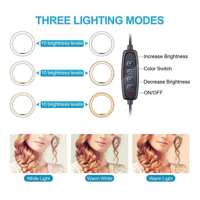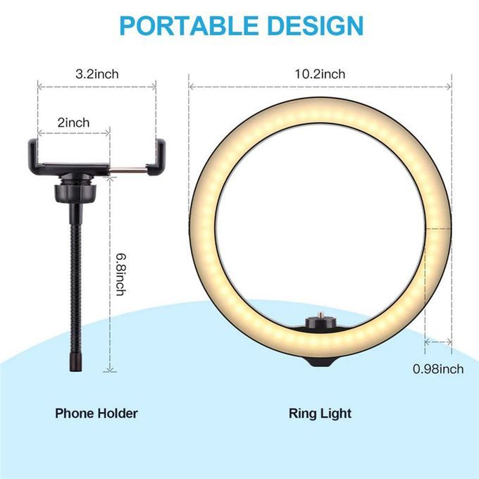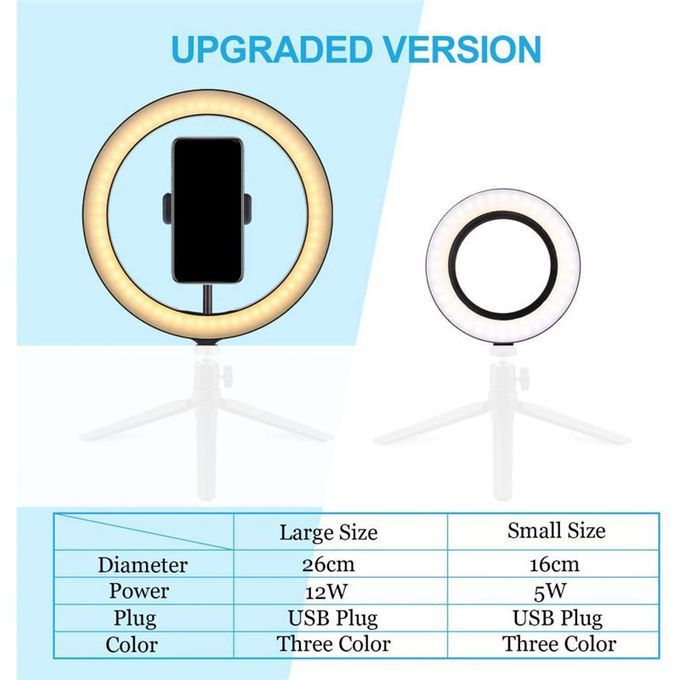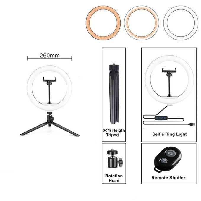 Features: [Universal Mobile Phone Holder]: The mobile phone clip holder is suitable for almost all smart phones. At the same time, it can rotate 360 degrees and the field of view is adjustable, whether horizontal, vertical or other angles. [USB Powered Design]: Works with most devices that support USB port, like laptop, PC, , USB charger, AC adapter, plug and play, convenient to use. [3 Colors Mode & 10 Brightness]: This 10'' ring lights provides 3 colors lighting mode(cold white, warm white, nautral). Each lighting mode has 10 levels adjustable brightness to choose which meet all your needs under different occasions and makes every photo/video more professional. [Foldable Mini Tripod Stand & Bluetooth Remote](Optional): The ABS foldable mini tripod stand, enough to meet your all desk needs, very easy to carry to everywhere and it is convenient for you to install, it can be folded in a small size when you don't need it. The remote control can make your selfie photo much easier. [Versatile Applications]: The ring light kit is perfect for makeup, live stream, selfie photos, video shooting, online tutorials, and the great gifts for best friends. Specification: Ring Light Diameter: 10.2inch Phone Clip Range: 2-3.2inch Light Color: Cold White, Warm White, Natural Light Power: 12W USB Voltage: 3.7-5V Color Temperature: 3000-6000K Package Includes: 1 Piece LED Ring Light 1 Piece 1/4'' Ball Joint Mount 1 Piece Phone Holder 1 Piece Tripod 1 Piece Bluetooth Remote Note: - Please allow minor errors due to manual measurement. Thanks for your understanding. - Monitors are not calibrated same, item colour displayed in photos may be showing slightly different from the real object. Please take the real one as standard.