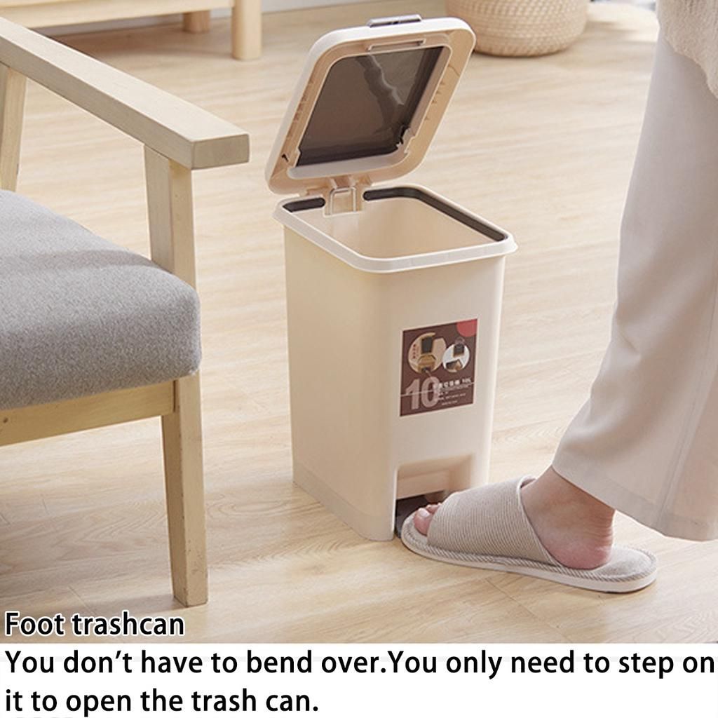 Material: Polypropylene Package included: 1 * Trash Can Specification: Type: Storage Bucket Shape: Rectangular Color: Beige Capacity: 10L Opening method:Pressing Type & Foot Pedal Features: 1.Foot trashcan You don't have to bend over.You only need to step on it to open the trash can. 2.Hand-pressed trash can Antler hooks are made of high quality ABS material. 3.Easy to clean Rigid plastic frame includes hooks or keeping trash bags in place Smooth surfaces and rounded corners make cleaning easier for more efficient maintenance