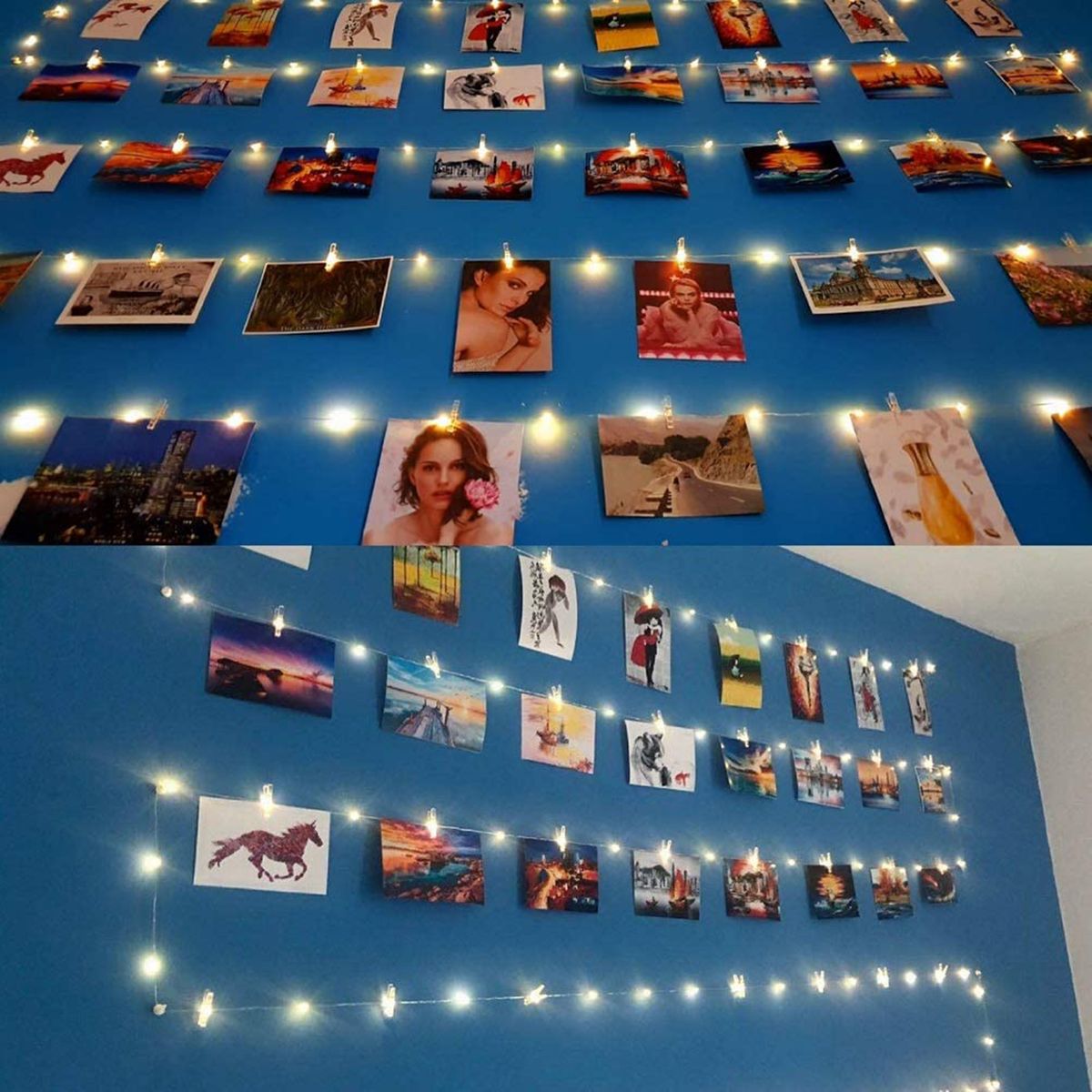 8 lighting modes, flexible wire, USB and battery powered, the string light with clips is suitable for hanging photos and create cozy starry atmosphere at night.