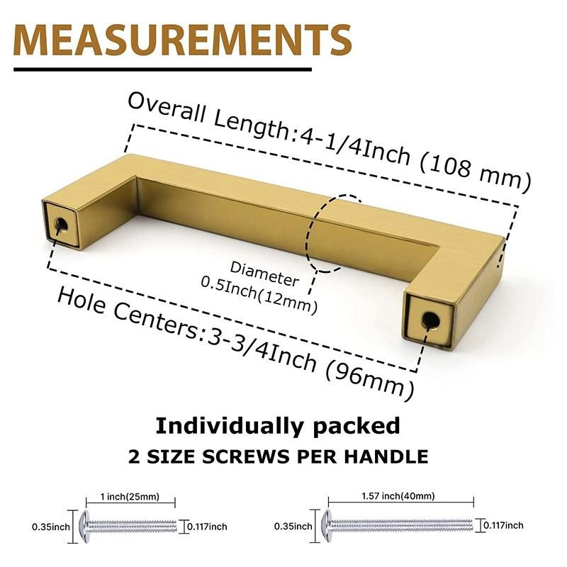 PACKAGE:M4standard screws (1 inch & 1.58 inches) matching each Brushed brass handle.Each Brushed brass pull is individually wrapped and packaged to protect from being scratched.