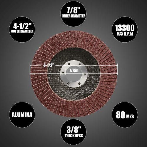 [EASY INSTALLATION & WIDE COMPATIBILITY]4.5 Inch Diameter, 7/8 Inch Arbor, Flat Type #27, 13300RPM maximum speed. Our flap discs are compatible with all brand 4.5inch angle grinder, such as Dewalt DWE402, DCG414B, Makita 9557PBX1, GWS8-45, Craftsman CMEG100, 1375A, PORTER-CABLE PC60TAG, PCE810, Black & Decker BDEG400, G950, Hitachi G12SR4 and More.