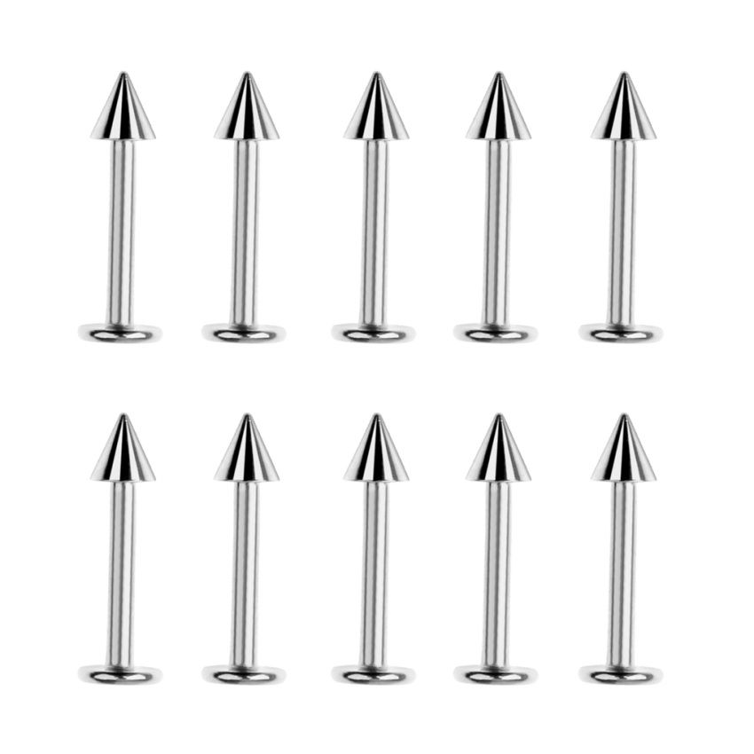 Size: About 3 x 3 x 3mm for spikeGauge: About 16G (1.2mm)Bar Length: 10mm/0.39inch(Approx.)Color : SilverMaterial : Stainless Steel