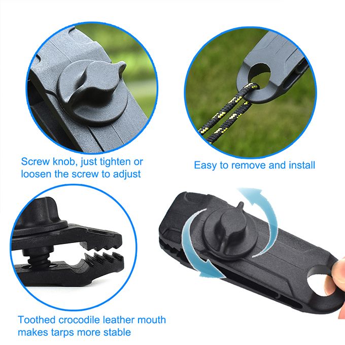 Made from durable, drop-resistant, high-strength PA materials, tarp clips allow you to safely re-use these tarps for long periods of time, Ideal for outdoor explorers, campers and travelers. Crocodile mouth design: The unique toothed crocodile mouth design makes the teeth more stable. Designed with adjustable helical thumbscrews, the mouth can be opened approximately 0.25 inches to fit the heavy duty tarp. You can get a 10 pack tarpaulin clip that can be carried anywhere lightly. The hole is 0.5 inches in diameter and can be easily stretched with elastic cord/hook to safely prevent the tarpaulin from falling. Simple installation and disassembly: Simply use the camping clips simply by tightening or loosening the knob to provide excellent grip pressure control without damaging the fabric. Widely used: Ideal for outdoor camping tents, awnings, caravans, tarpaulins, canvas, awnings, boat covers, swimming pool covers, temporary coverings or any fabric that requires extra support points.