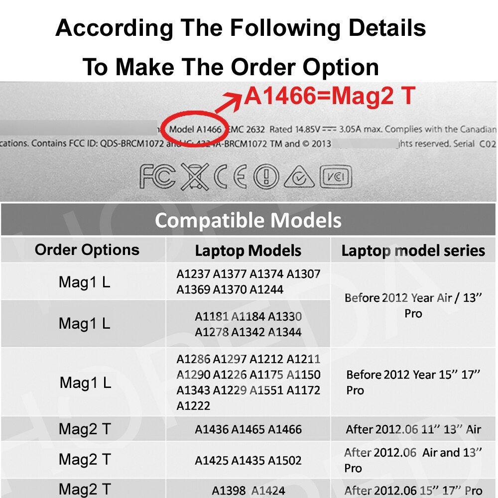 DescriptionCondition:NewQuality: Grade AQC: TEST 1 by 1 before shippingWarranty: 12 MonthCompatible: For Macbook Power Adapter Charger Cable Repair CablePackage include: 10pcs* Repair CableAnttention: 60W,45W,85W are compatible, We will send 60W,Please check your laptop power adapter model details before order.Mag1 L = For macbook before Mid-2012 Year Models. ( A1181,A1342,A1278,A1286,A1297,A1370,A1369)Mag2 T= For macbook Late Mid-2012 Year Models ( A1465,A1466,A1425,A1398,A1425,A1502)