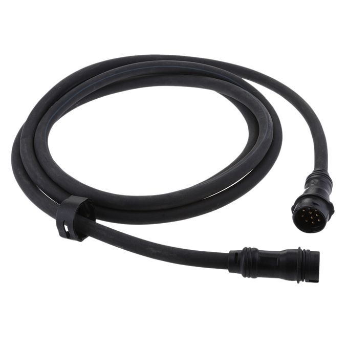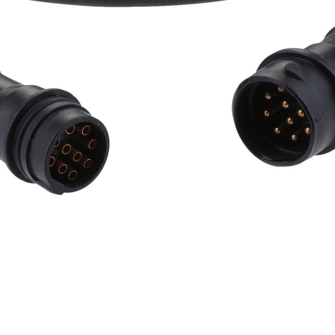 Black in color and has a female 10-prong and a male 10-prong connector.