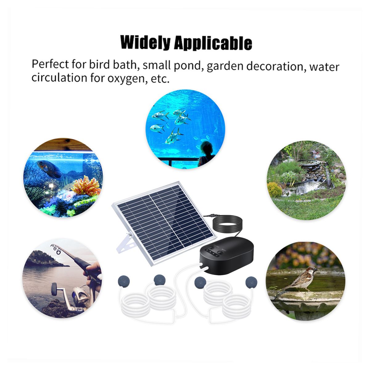 1 x Solar Panel,1 x Oxygen Pump,1 x Package of Accessory,2 x Air Stone,1 x Aquarium Oxygen Pipe,1 x Manual,Note: This product is an electronic product. The oxygen-increasing device cannot be placed in water, and the diversion hole cannot be blocked.