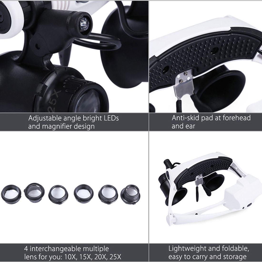 10X 15X 20X 25X Wearing Glasses Eyes Illuminated Magnifier Magnifying Watch Repairing Loupe With LED Light(White)