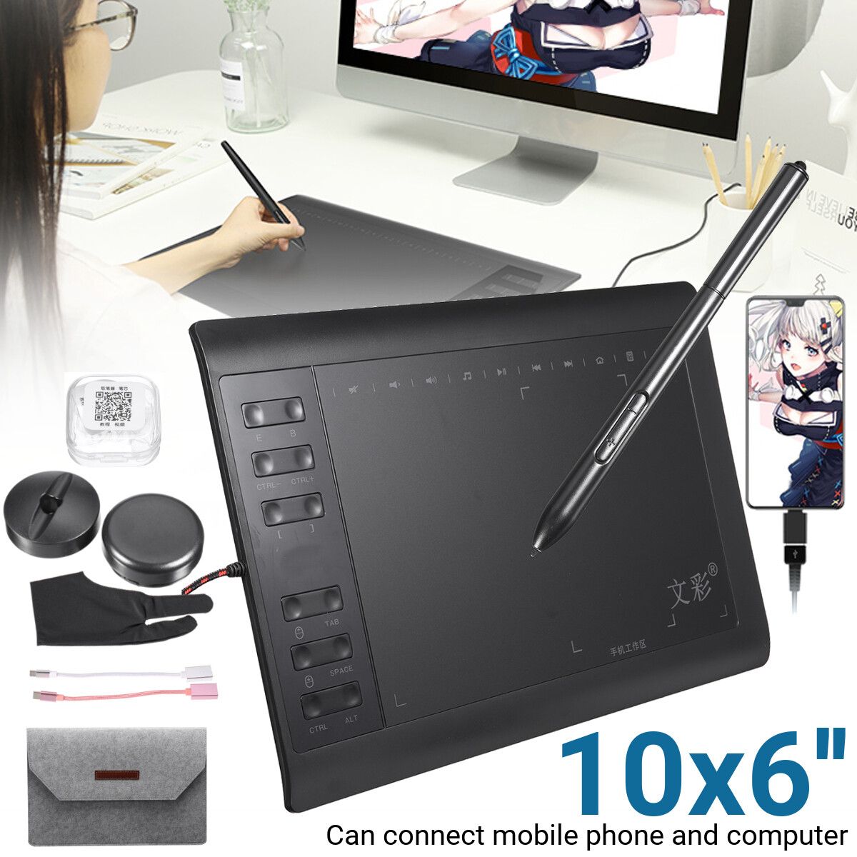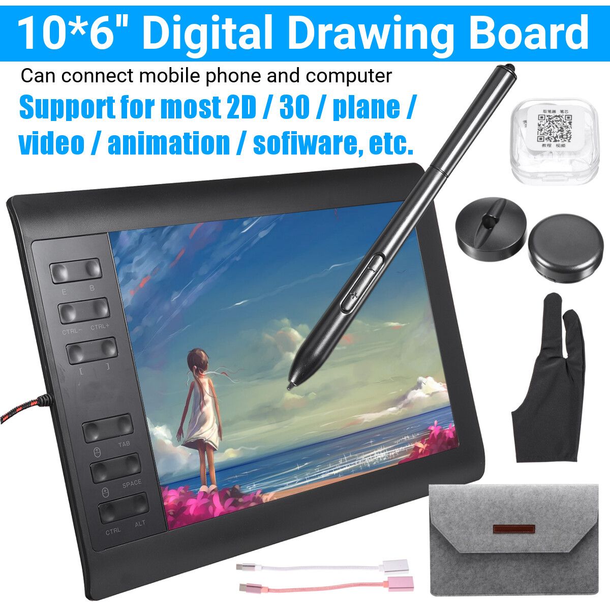 1x Drawing tablet,1x Drawing pen ,1x Pen holder ,1x Pen picker,1set Pen refill ,2x OTG cable (MicroUSB, Type-) ,1x Copy ,1x Hand Feel film,1x ,1x Bag ,1x User Manual