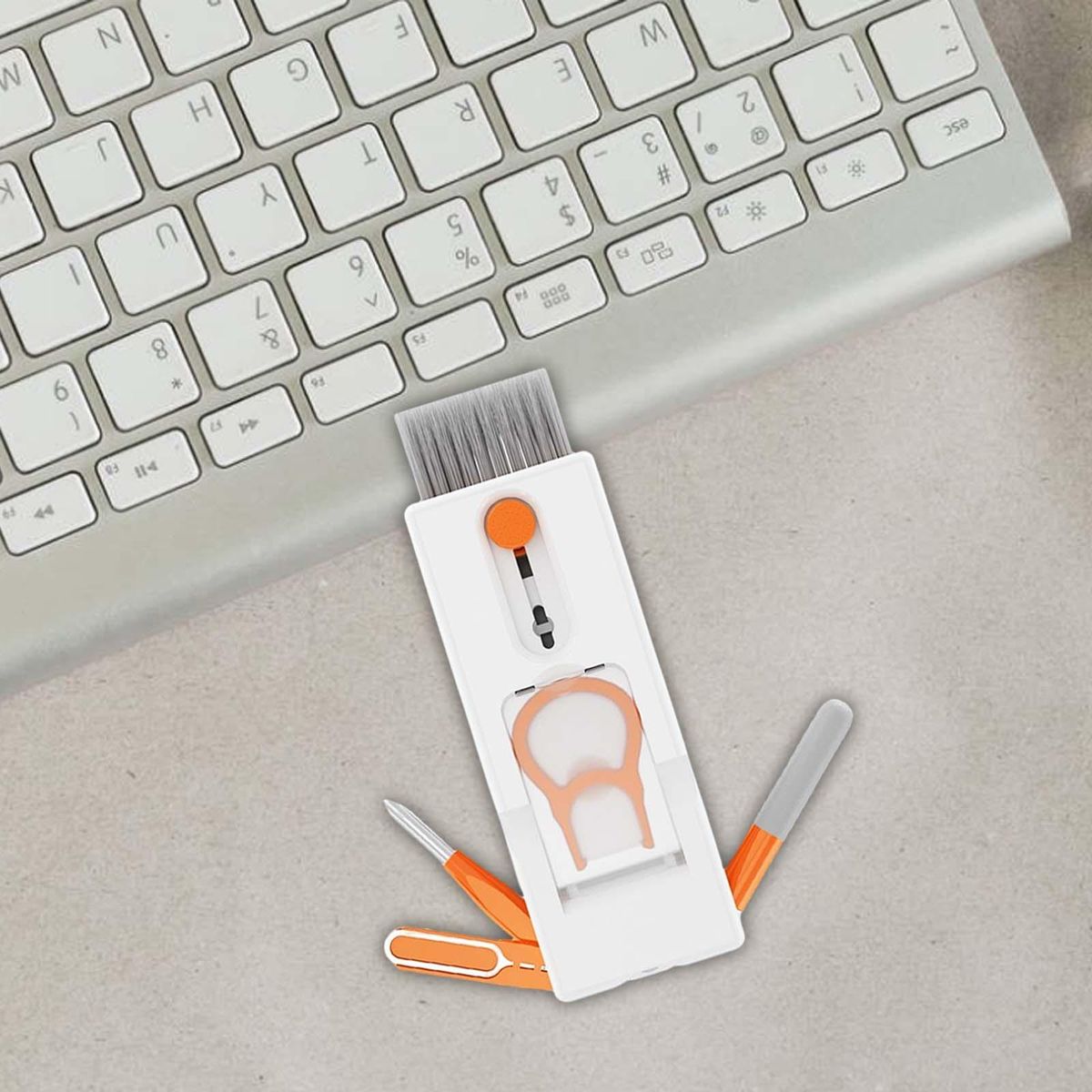11 In 1 Multifunctional Cleaning : A total of 11 functions for different cleaning site needs, with card extractor, Wash flannel, empty spray bottle, brush, Key puller, pen tip, Lens cleaning cloth, Phone holder, Density brush, Long brush, detachable memory foam stick,etcUseful Tools: cleaning for keyboards, headphones and all kinds of electronics with screens.Compact Size: about 10.6cmx4cm/4.17inchx1.57inch. Lightweight and portable, the cleaning takes up minimal space and is easy to storeFoldable Design: Retractable brush and storage both ends when not used. Keyboard Cleaning Tool: The key puller in the package and the large brush at the bottom of the storage box are used to disassemble and clean the dirt in the of the keyboard