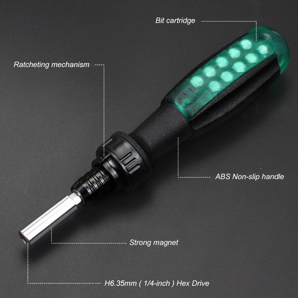 The bit cartridge, a hidden storage case inside the handle of screwdriver, makes it easy to find, change and store bits.