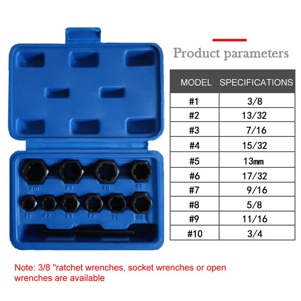 Extractors size:3/8, 13/32, 7/16, 15/32, 13mm, 17/32, 9/16, 5/8, 11/16, 3/4