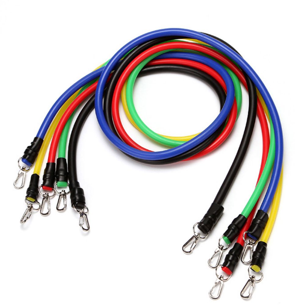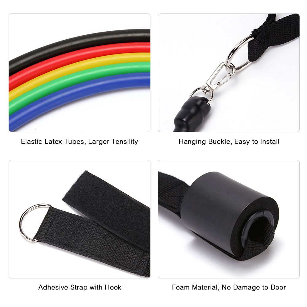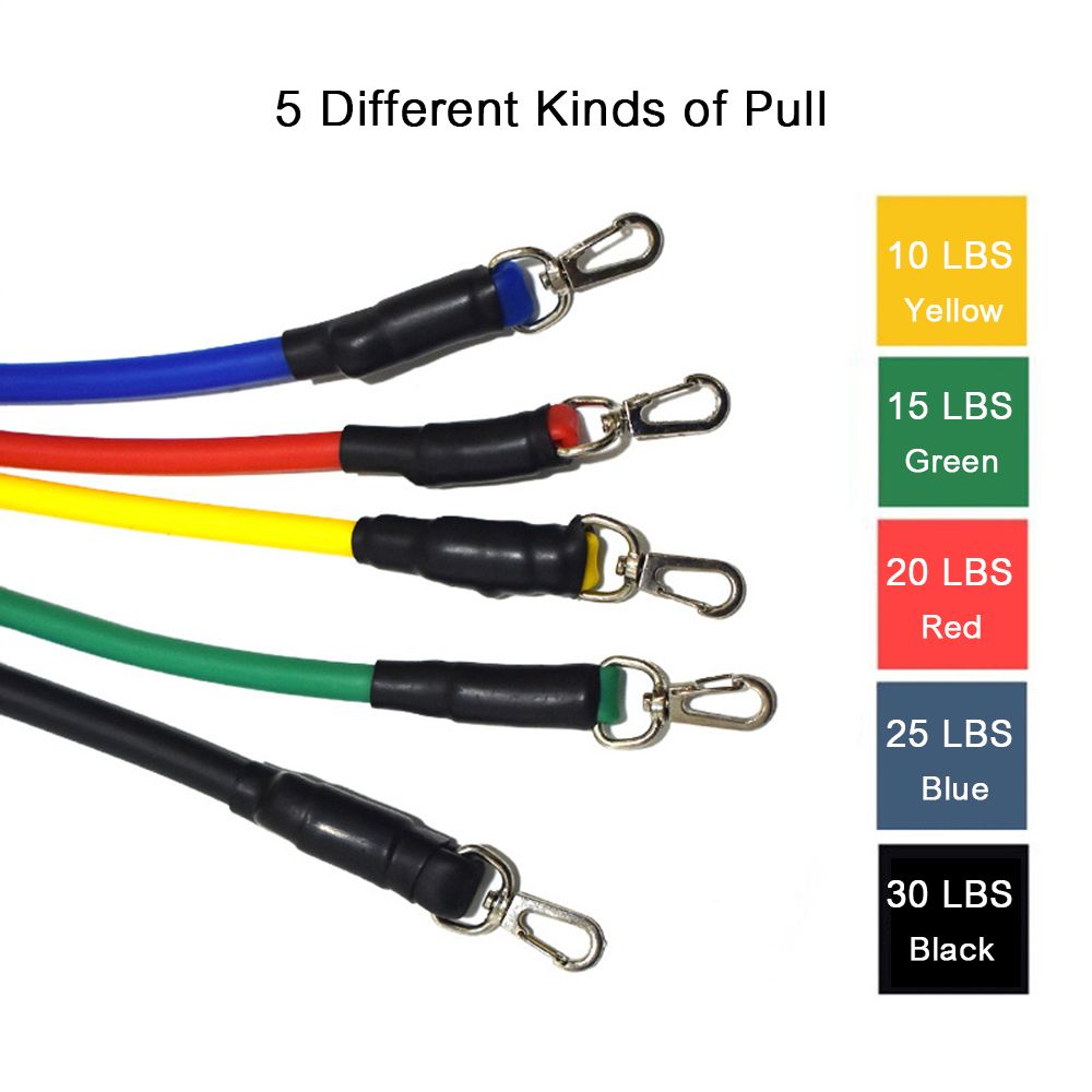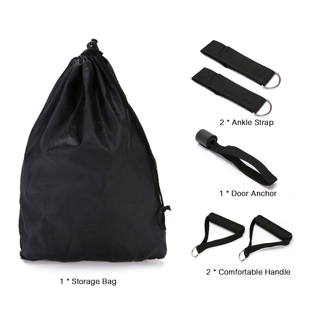11 Pcs Pull Rope Set: 5 different colors of pull ropes with different pull, 2 ankle straps, 2 comfortable handles, 1 door anchor and 1 storage bag for easy carrying.