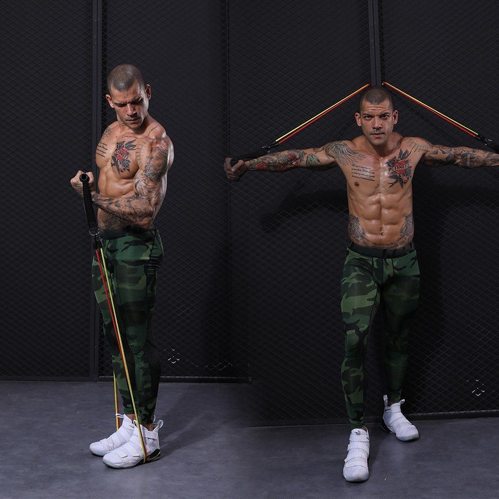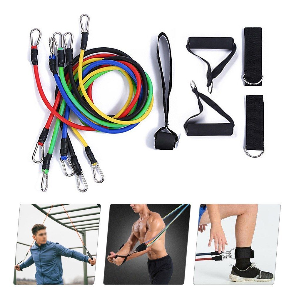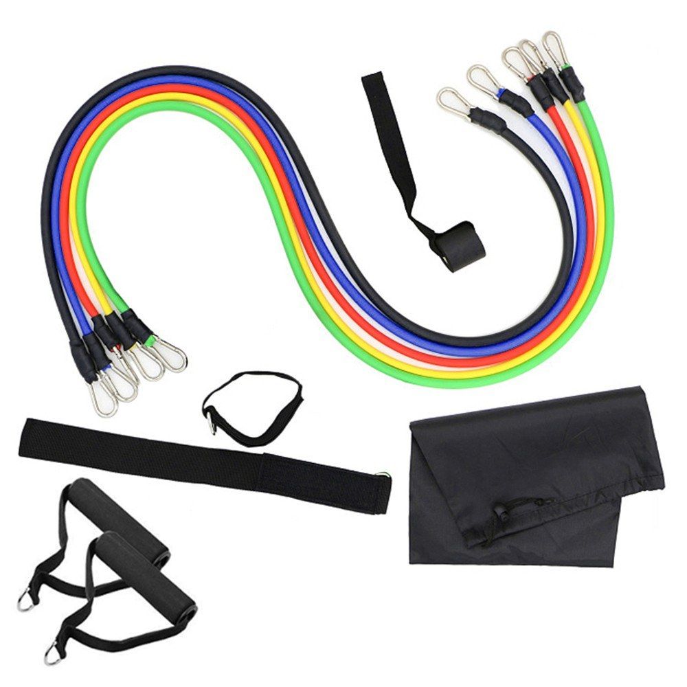 This 11Pcs Fitness Bands Set includes 5 diferent Tube Bands,2 Cushioned Foam Handles,1 Door Anchor,2 Ankle Straps and 1 Carry Bag,which help to vary your workoutroutines and challenge yourself to achieve higher levels.Packed in the included carry bag,the workout set will surely be a convenience and guarantee a much moreinteresting trip.