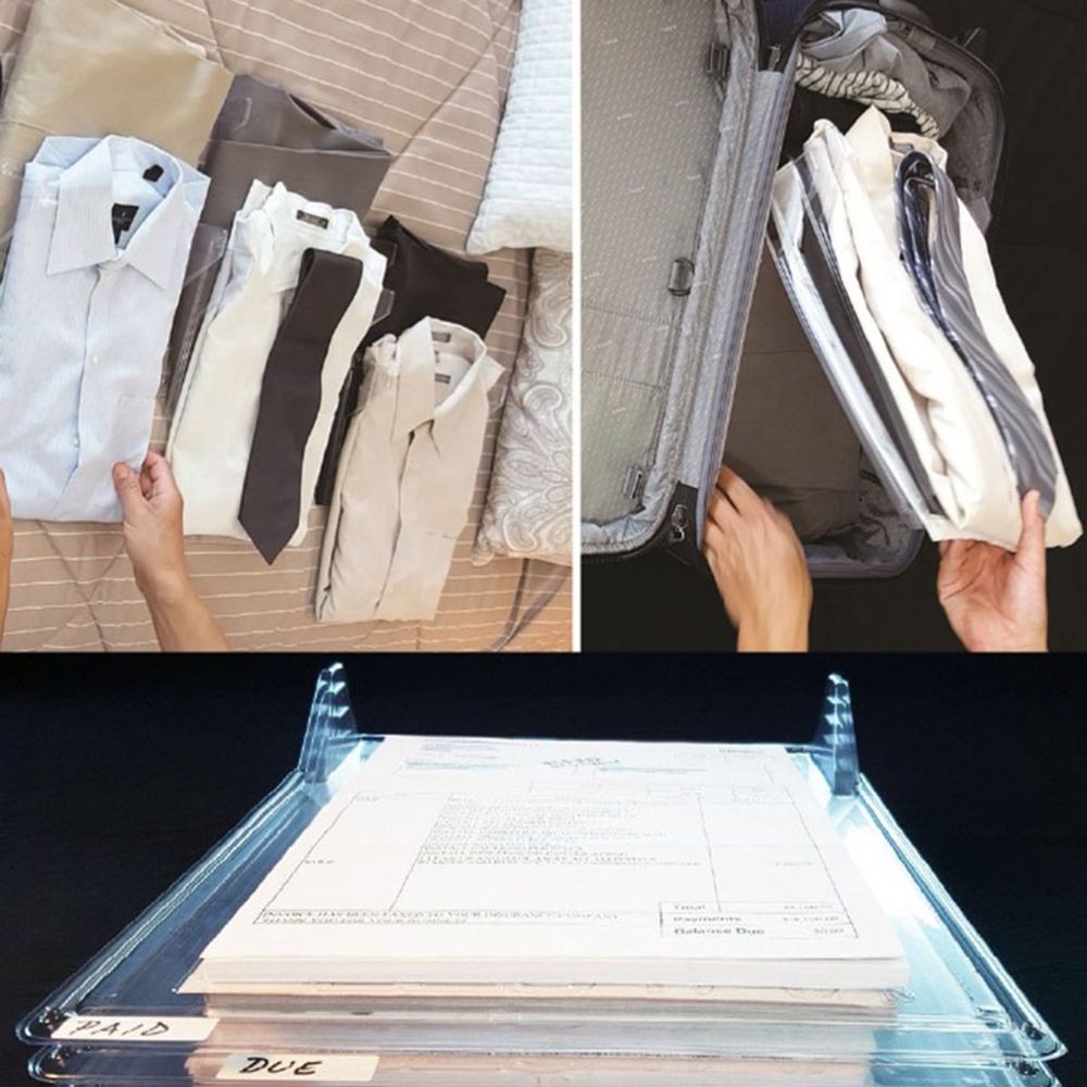 Fits neatly into your suitcase to keep your clothes from bunching and wrinkling.