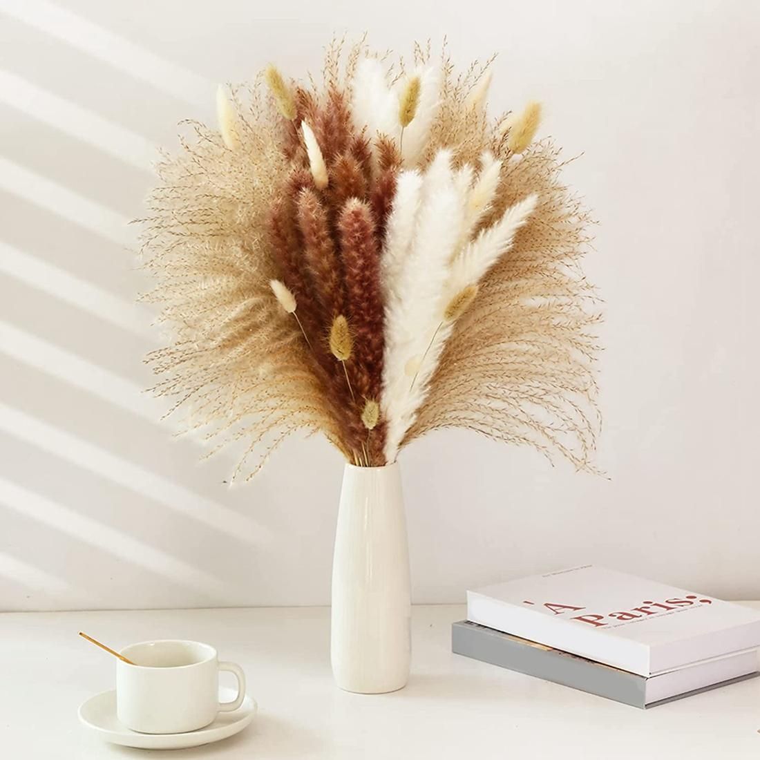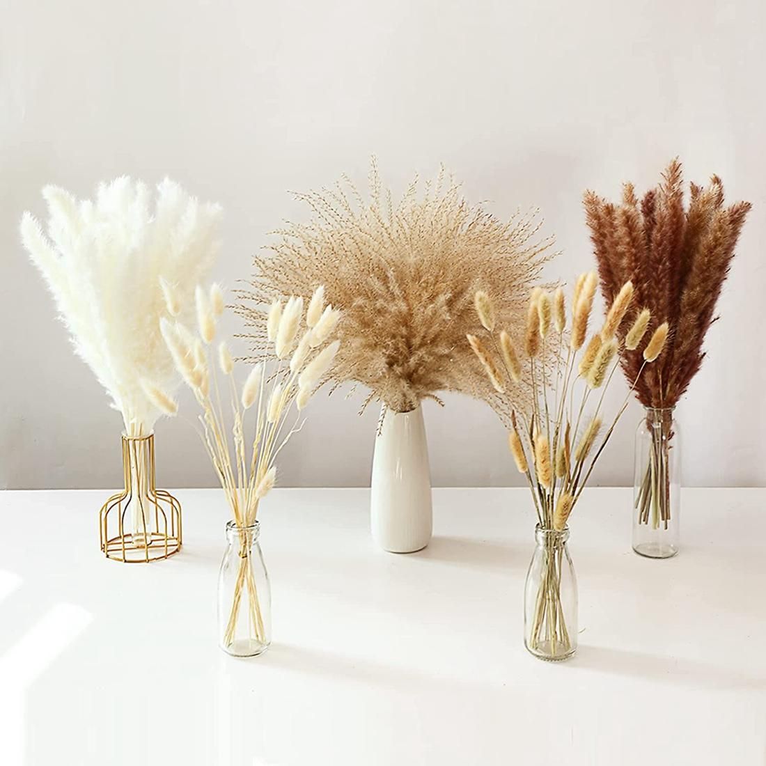Detailed Information About The Product:Mix and MatchThis dried pampas grass comes with everything you need for the ultimate DIY experience, including 20pcs white pampas grass, 20pcs brown pompous grass, 30pcs bunny and 40pcs reed grass. Each is approximately 17.5in high, as the length of this pole has a lot of cutting space so you can cut white pampas grass according to the size of your vase.without pampas grass vase)