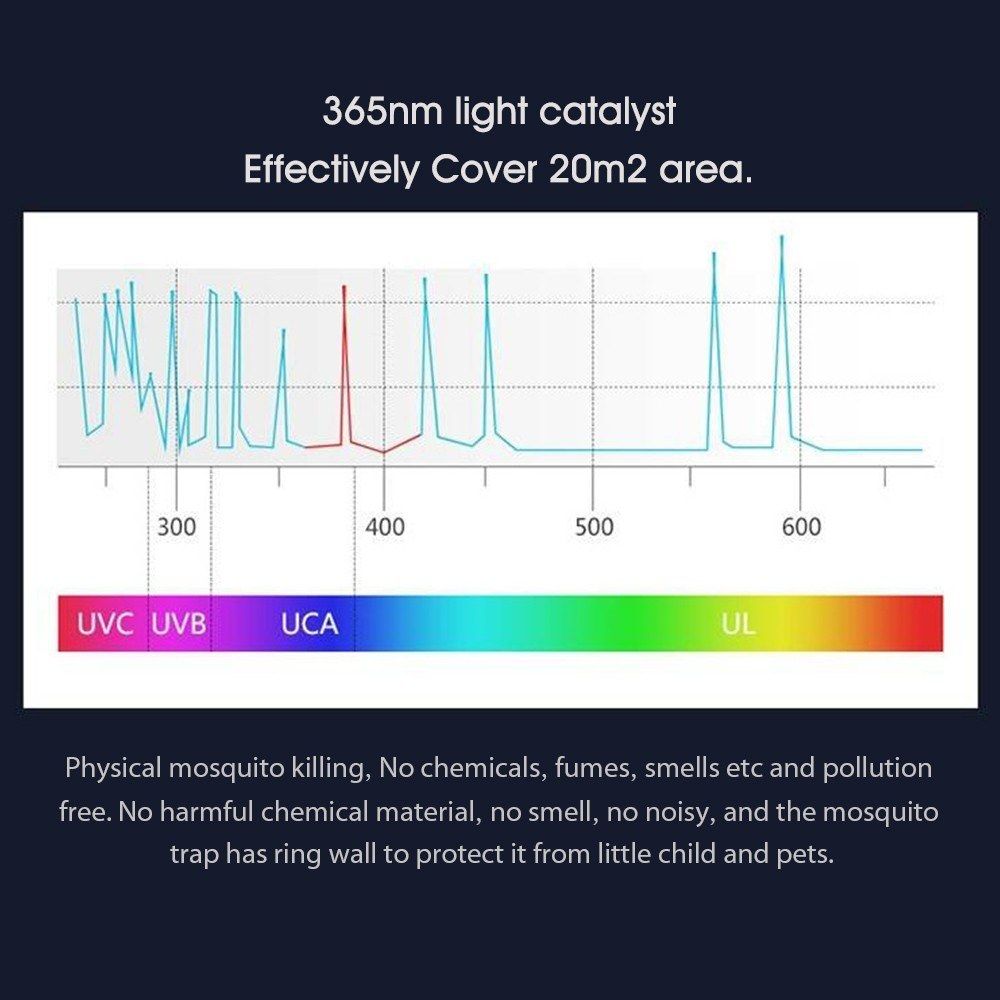 No harmful chemical material, no smell, no noisy, and the mosquito trap has ring wall to protect it from little child and pets.