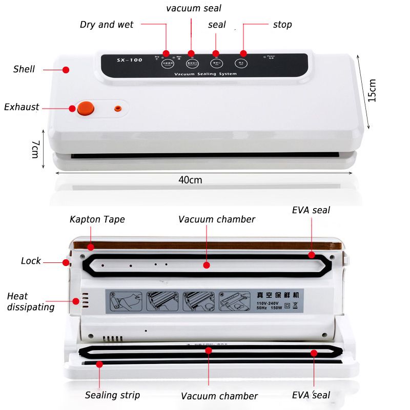 1. Product: Household Vacuum Food Sealers2. Color: black3. Power: 110V,220V4. Size: 410*155*85(cm)5. Max Thermal sealing length:33cm6. Plug: US plug,EU UK AUplug/adapterAbout the button:1. Various functional modes are available, dry, wet, kraft bag, tea bag.2.Super suction, overheat protection, vacuum equipment is safer.3.It is especially emphasized that liquid can not be pumped. If we need to vacuum the liquid, we need to freeze it first.4.For food containing little moisture or oily products, this product can seal and vacuum.5.We will match the transition plug for the corresponding country.Notice:1. Please use the bags that have veins(grain).2. Please choose the suitable voltage and plug.3. Parcel including: Machine*1 ,tuning duct ,Bags*7(pics),Manual*14. For foods that contain liquids,seal it after remove the excuss water or packed with plastic wrap.