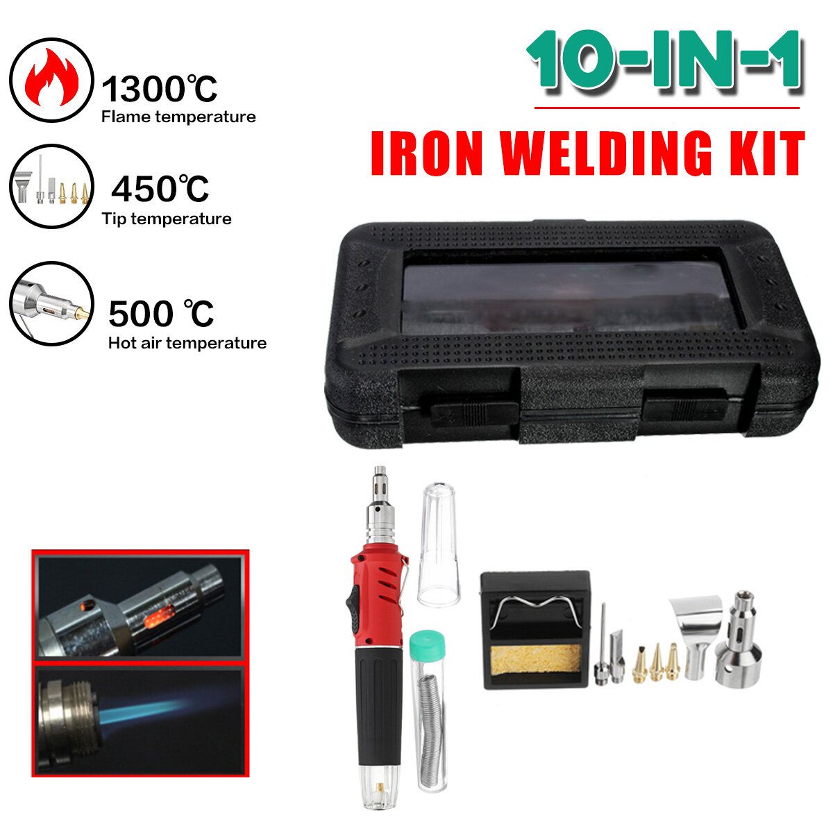 Specifications:Name: 10-in-1 Electronic Ignition Gas Iron With Automatic Ignition FunctionModel: B54285Material:PlasticGas Container Capacity: 26mlOperating time: 100-200mins (One Gas Filling)Temperature Value:Blow Torch Tip Up To : 1300 ℃ Tip Up To : 450 ℃Hot Blow Tip Up To : 500 ℃Size: approx. 24.5x13x 5.5cmProduct Weight: approx. 416gApplication:1. Relaxation corroded metal screw kit heated Research LaboratoryKitchen baking tool factory maintenance2. Welding cars, trucks, aviation repair repair hydropower project3. Electrical appliances, electrical control box repair welding4. Wire circuit board repair welding IC board welding repairsHome field line multi-use welding repair5. tin welding6. Jewelry, Eyewear plastic maintenance industry