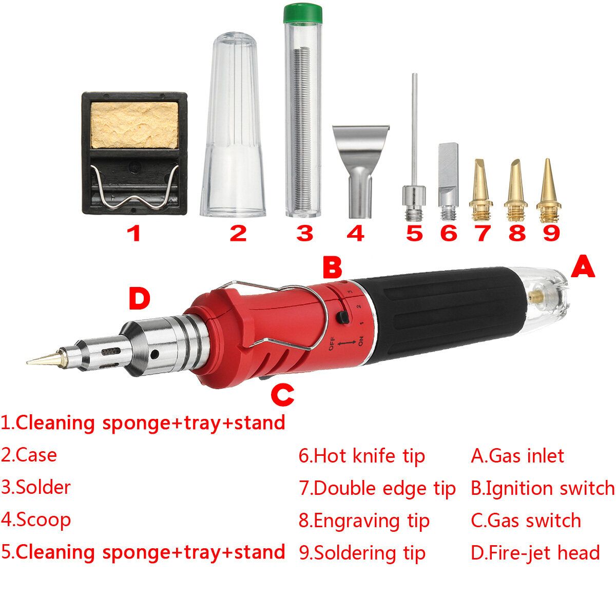 1 x Blow Torch 1 x Tip 1 x Hot Tip 1 x Point Tip 1 x Double Edge Tip 1 x Tip 1 x Scoop 1 x Case 1 x Resin Core Solder 1 x Cleaning Sponge + Tray + Stand 1 x Instruction book
