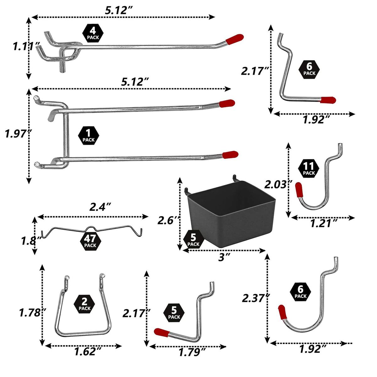 Includes 15 different types of hooks and organizers, straight hooks, curved hooks, angled hooks, multi-tool rack, and pegboard bins plus 60pcs of peg locks all in together as 140pcs of pegboard hooks assortment, is fully functional for a wide range of hanging applications.