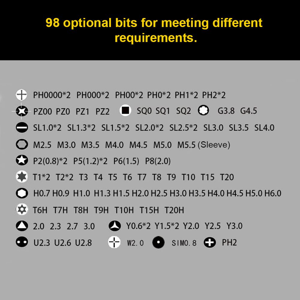 98 bits optional for meeting different requirements and easy to remove all kinds of screws, such as cross screw, regular triangle screw, H-type screw, Pentagon screw, slotted screw, Y-type screw, hexagon screw, inner-hexagon screw, etc.